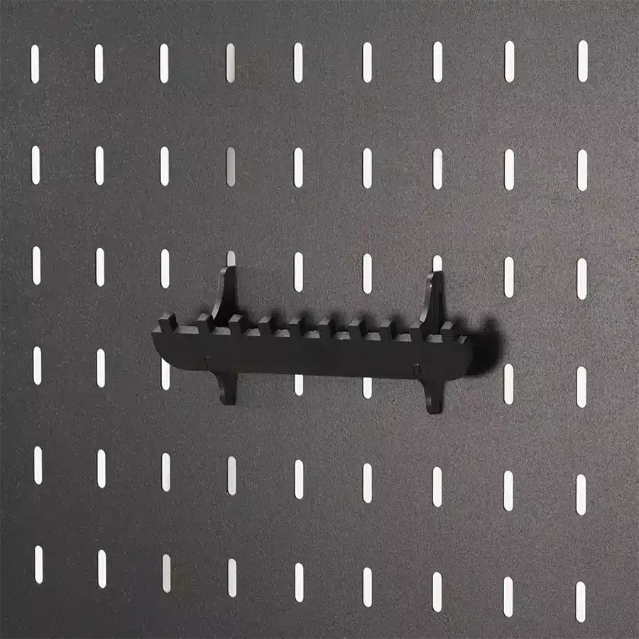 It mounts directly to any Flextur 14-gauge metal pegboard or tool board, including workstations, wall panels, and mobile tool boards. Whether you need to access sockets quickly or simply want to reduce clutter, this socket holder adapts to your workspace layout. Move or reposition it easily to match your changing workflow and organizational needs. American Made in Dalton, Ohio U.S.A.