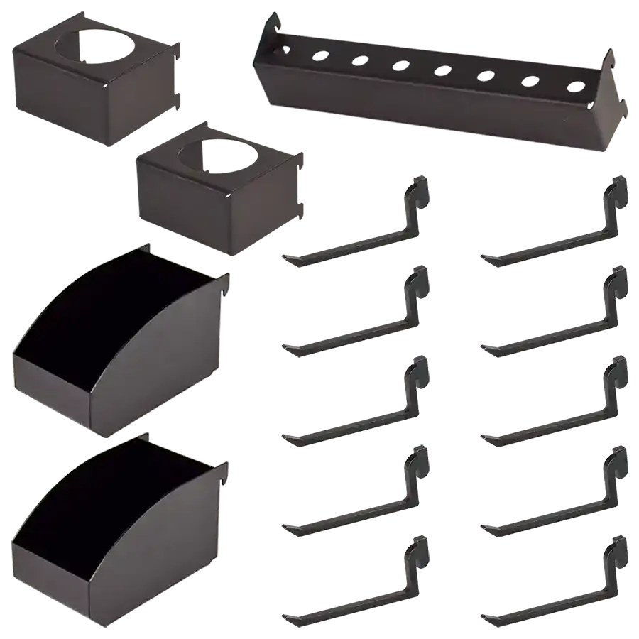 Flextur 15-piece Utility & Tear Down Cart Accessory Kit transforms your cart into a fully organized, high-efficiency workstation. Designed to maximize the functionality of Flextur Utility and Tear Down Carts, this versatile kit includes 15 heavy-duty steel accessories that mount directly to the integrated metal pegboard/tool board panels.