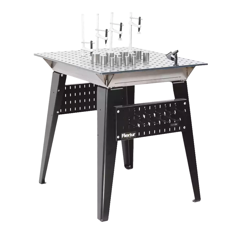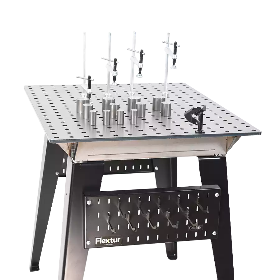 Flexturâ„¢ Welding Table 36″L x 30″W x 35″H, 1,000lb. capacity. Includes 27 Piece Fixture Kit. Ideal for smaller jobs. Use with Flextur and Metal Pegboard Accessories.