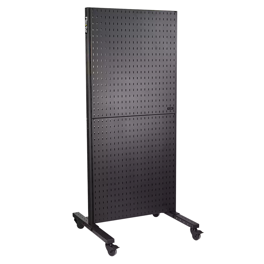 Flextur 4-Panel Mobile Tool Board with 71 Piece Accessory Kit features 3″ swivel locking casters, 900lb capacity, and four 14-gauge panels – one on the front and one on the back. This sturdy matte black powder coated Mobile Tool Board keeps all tools within reach while allowing for easy mobility.