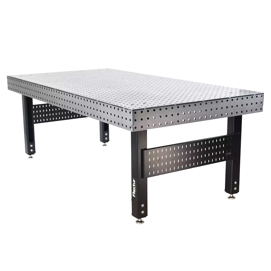 Flextur Welding Table 48″L x 96″W x 35″ to 41″H, with 1/2″ top supported by 3/8″ x 5″ struts every 16″, Flextur Tool Board panels, adjustable legs from 35″ to 41″ high, and a 6,000lbs. capacity. Surface flatness is +/- .015″ over 4 square feet. Changeover is easy and quick with movable 16mm locator pin in a 2″ grid pattern. Skirting along all sides has the same hole configuration and gives the flexibility to extend your table in any direction, up to 24″, with a Flextur Fixture Block for larger Weldments. Well suited for larger jobs Flextur Welding Tables will improve accuracy and greatly reduce set up time for complicated Weldments. Inexperienced Welders can easily make an accurate setup and become productive in minutes with this Welding Table. Onboard steel Flextur tool board panels keep tools organized and within easy reach. Base requires assembly but all welding table tops ship assembled. A complete line of Flextur Accessories, ordered separately, are available to outfit your table. American Made in Dalton, Ohio U.S.A.