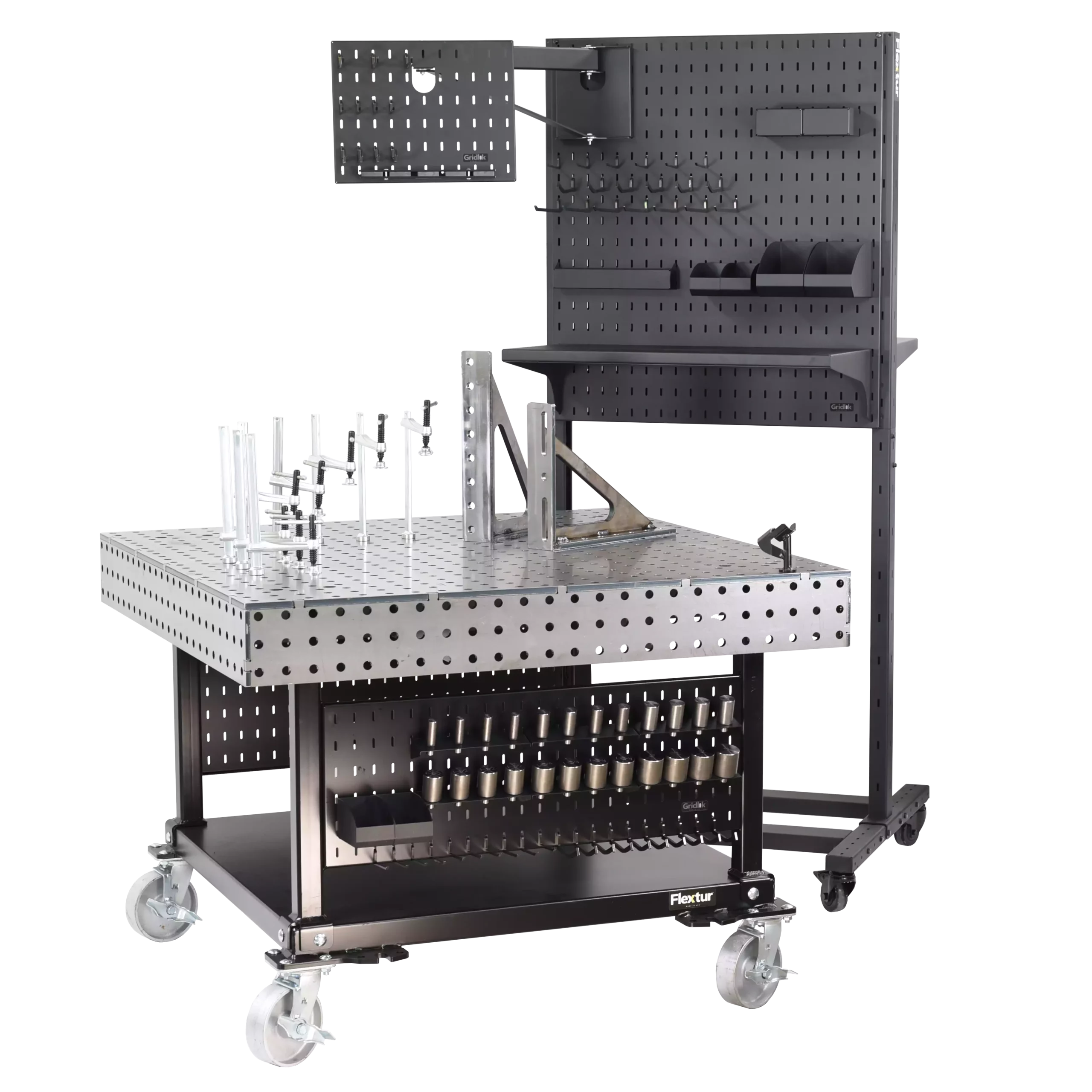 Flextur Welding Station with Flextur 48″L x 48″W x 35″H Welding Table, 57 Piece Fixture Kit, Gridlok 2-Panel Mobile Tool Board with Base Runner Support and 41 Piece Gridlok Accessory Kit.